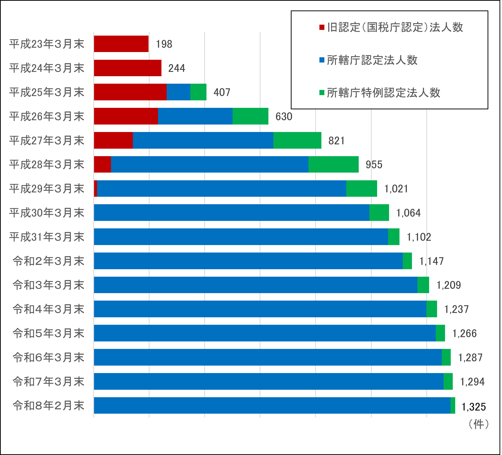 ※上記グラフにおける認定法人数のうち、所轄庁認定数及び所轄庁特例認定数は、各月末の法人数を示す。旧認定(国税庁認定)法人数は、翌月初の法人数を示す。